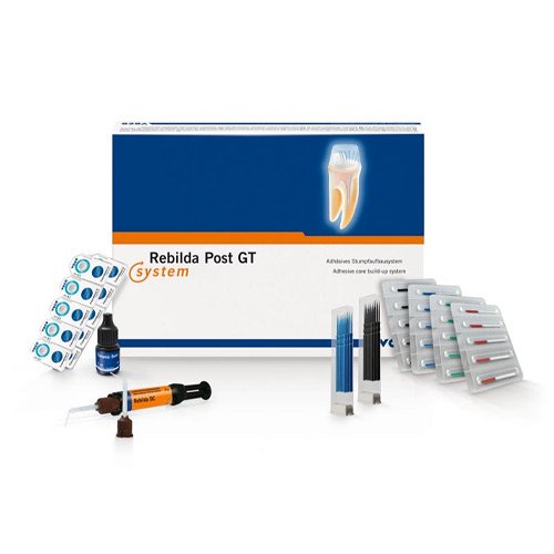 -Set 5 posts each of (diameter ~ 0.8 mm, ~ 1.0 mm, ~ 1.2 mm, ~ 1.4 mm), Ceramic Bond bottle 5 ml, Futurabond U SingleDose 20 pcs., Rebilda DC QuickMix syringe 10 g dentine, accessories